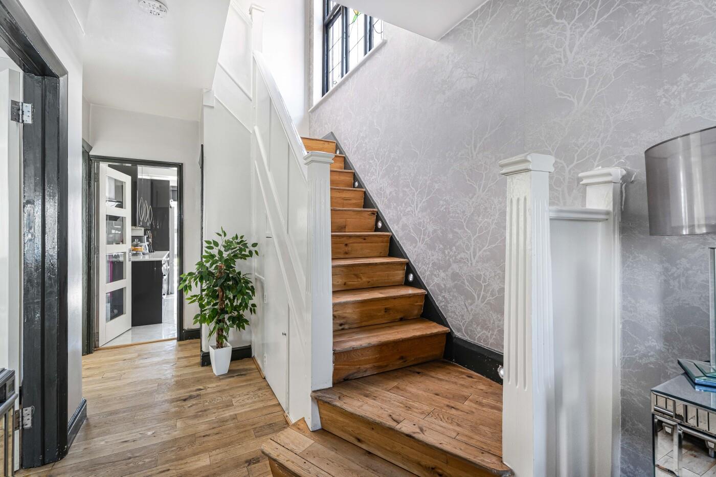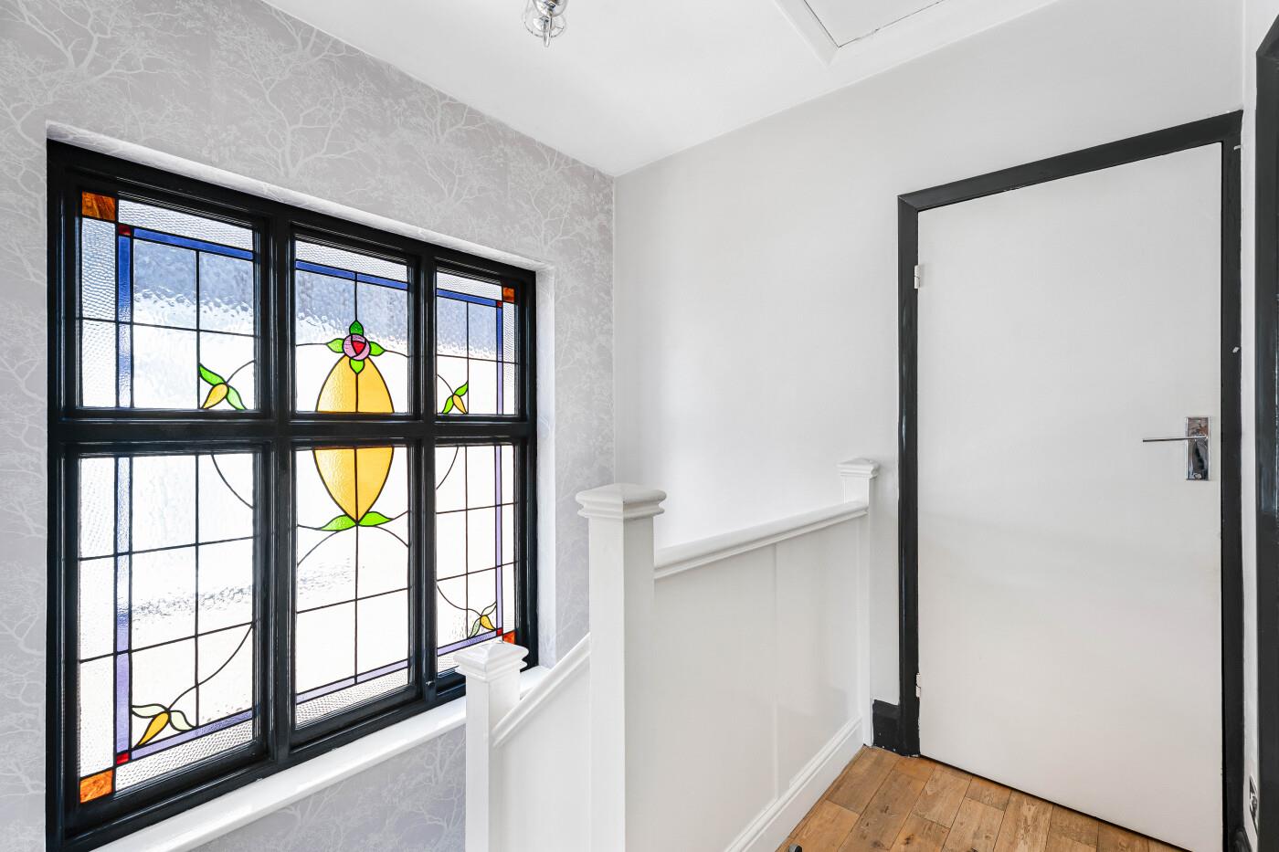 FIRST FLOOR LANDING Stained Glass window to side allowing natural light to flood the hall & landing, oak covered treads & risers on the stairs upto first floor, oak flooring and neutral decor.