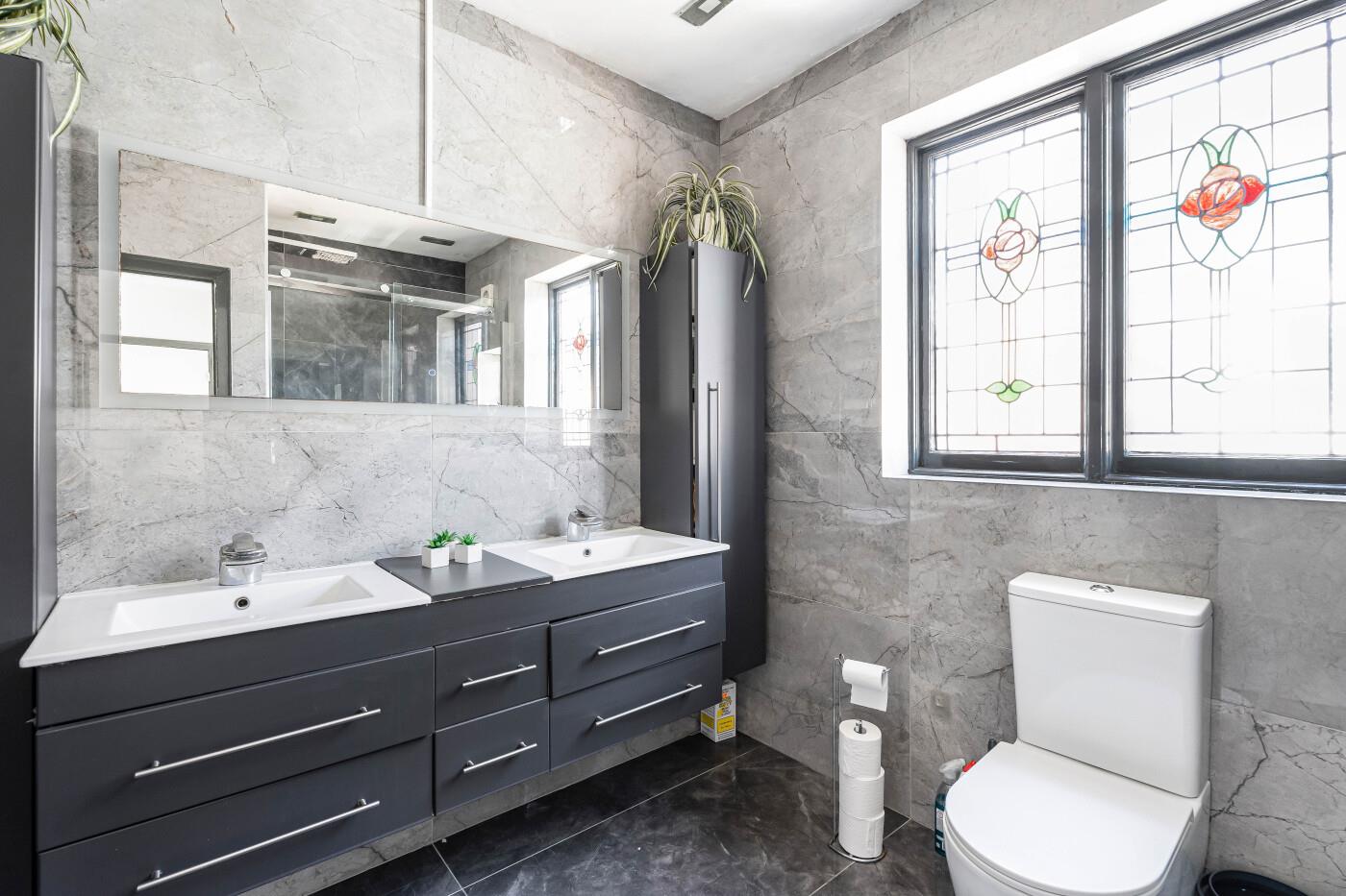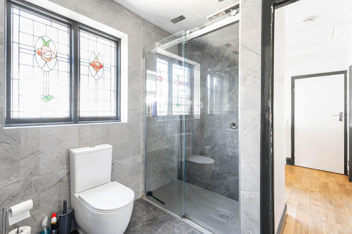 SHOWER ROOM Stained glass window to side, fully tiled walls & floor, large shower cubicle with sliding door, wall-mounted double sinks with vanity unit beneath and large mirror over, WC.