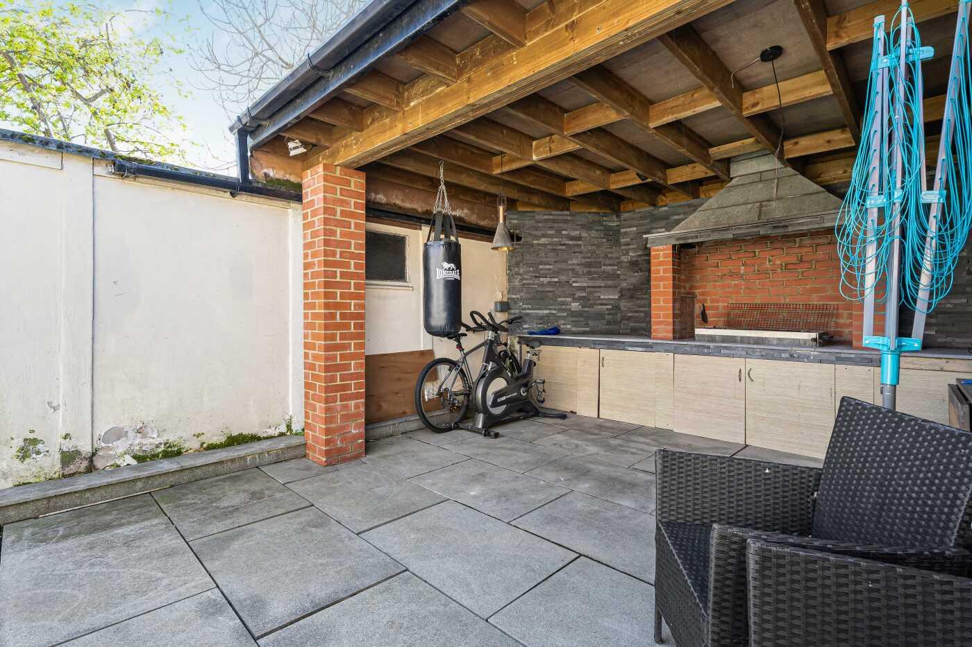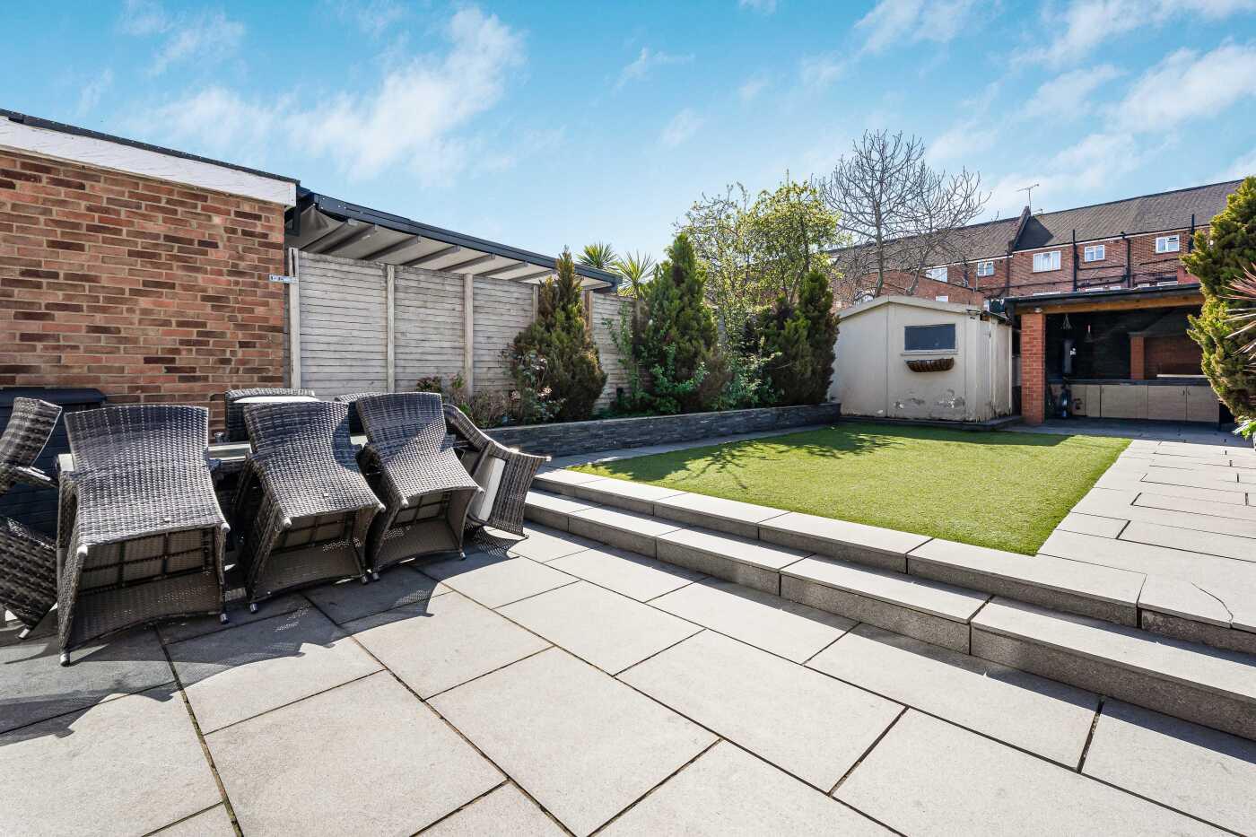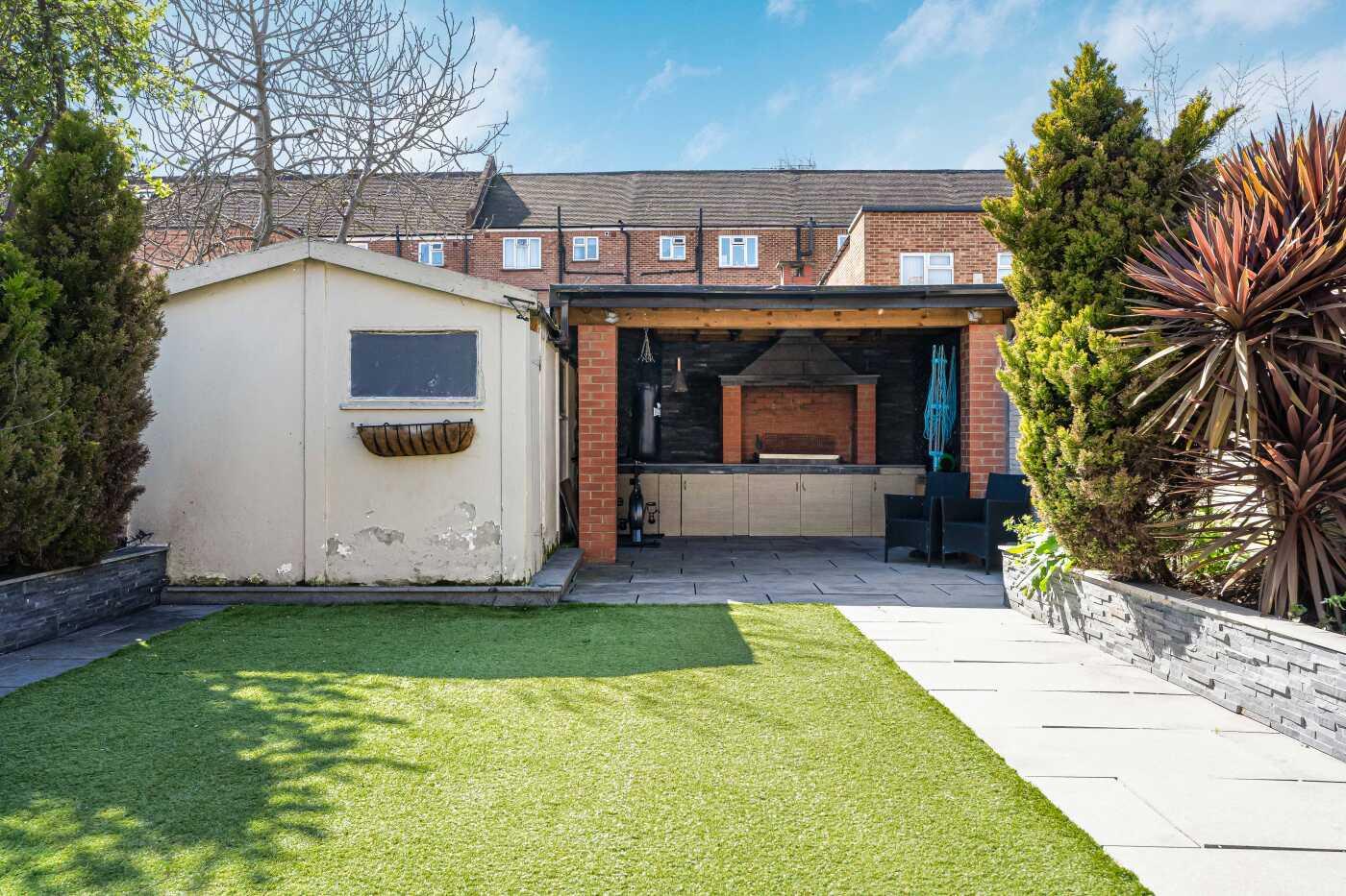 60FT REAR GARDEN WITH PATIO, ASTROTURF LAWN & COVERED BBQ AREA