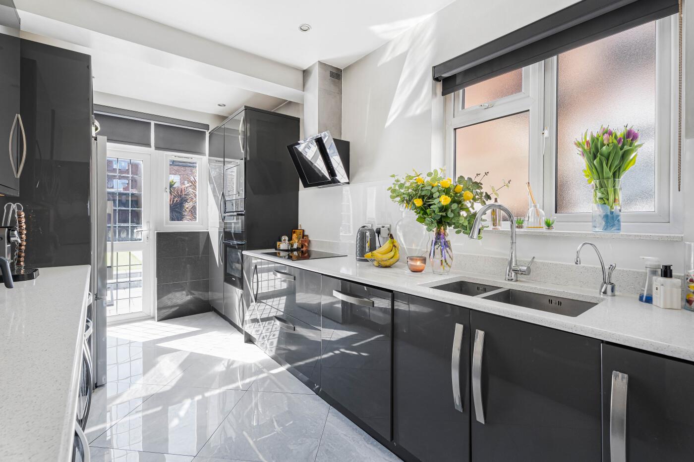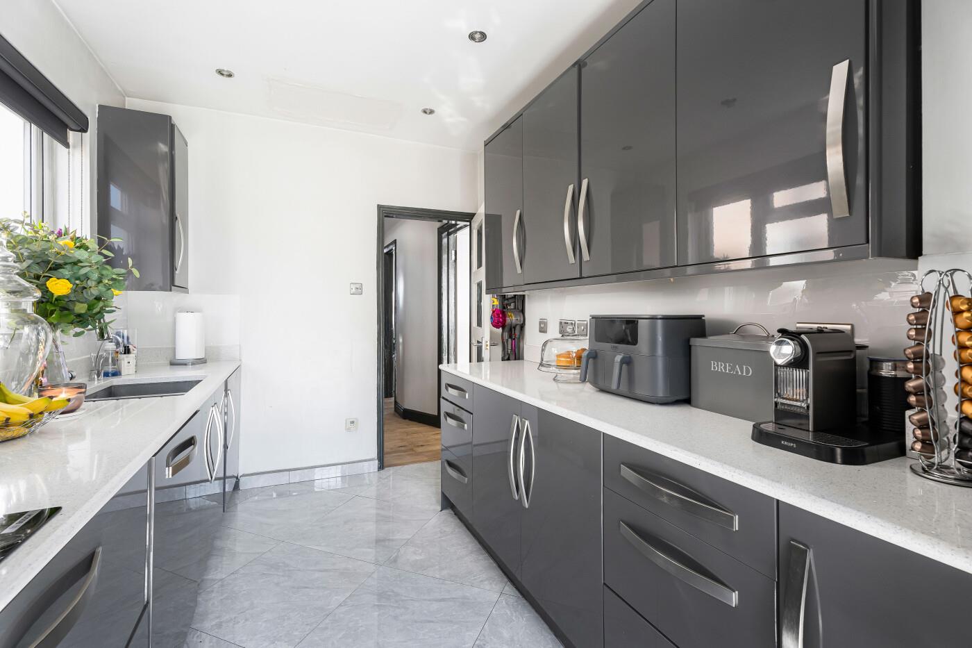 KITCHEN (4.60m x 2.36m (15'1 x 7'9)) Double-glazed door to rear and window to the side, fitted with modern grey gloss wall & base units, with white quartz upstands & glass splashbacks, white quartz worktops with under-mounted double stainless steel sinks with Mixer tap & an INSINKERATOR hot tap, with filtered cold water, plus integrated appliances including; washing machine, dishwasher, double-oven & microwave above and induction hob with extractor above. Tiled flooring and spotlights to ceiling.